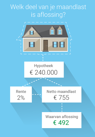 Om je een indicatie te geven welk deel van je maandlast uit aflossing bestaat, hier een korte rekensom. Een hypotheek van 240.000 euro met een rente van 2 procent, heeft een netto maandlast van 775 euro. In dat bedrag zit al meteen 492 euro aflossing. Dat is ruim 63 procent van het totaalbedrag.